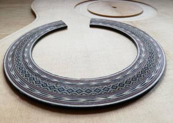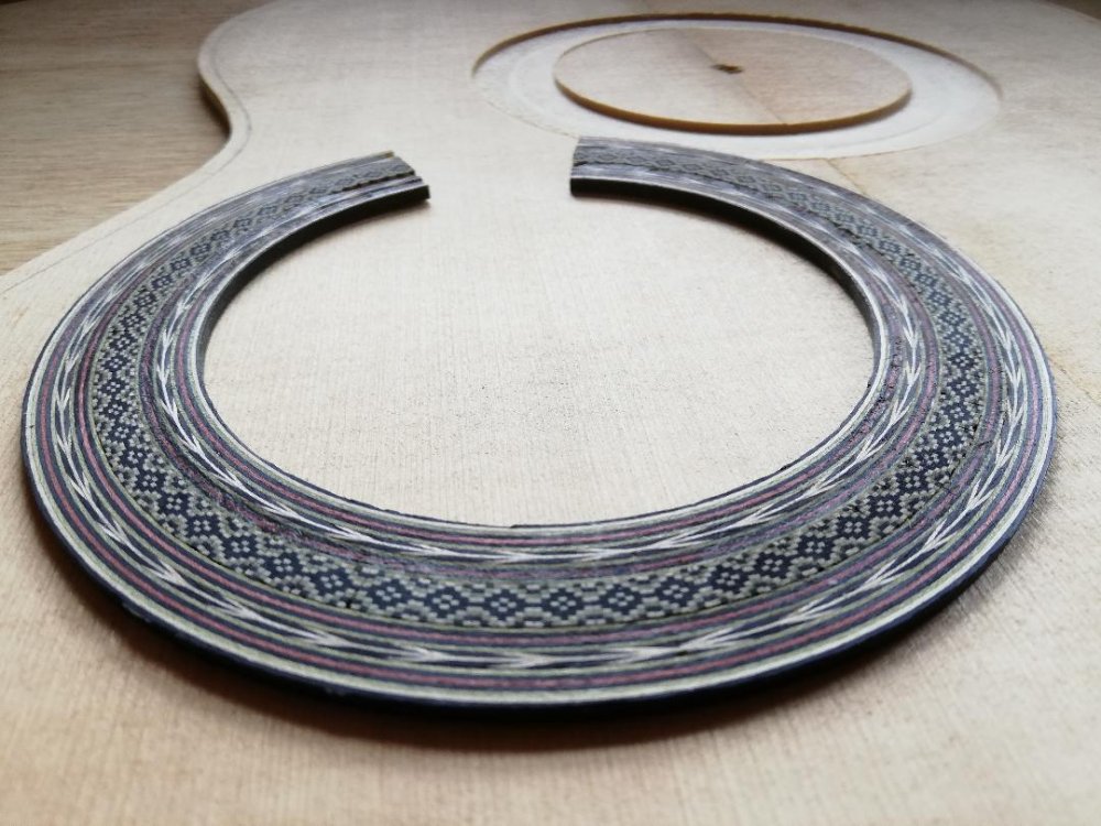 Standard guitar rosette made entirely by hand from coloured timber veneers